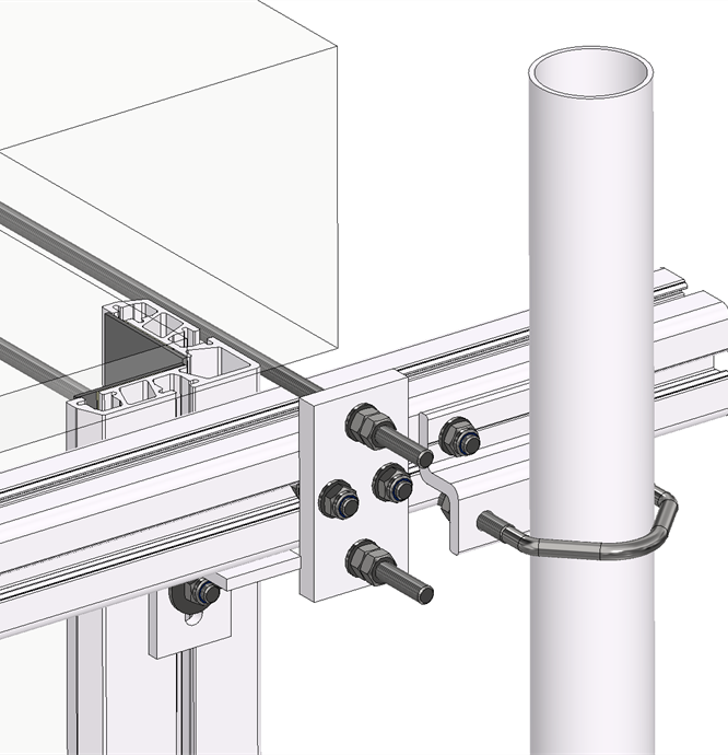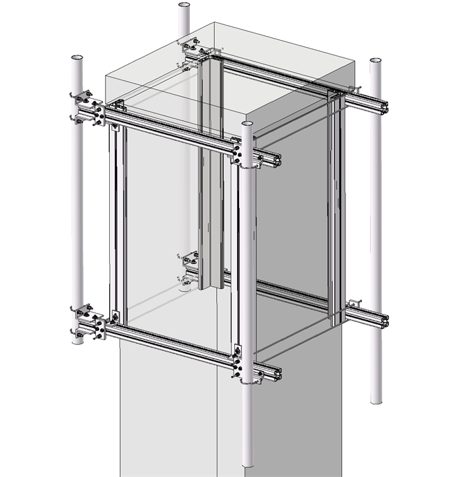 Struktura jest zaciskana na kominie jak imadło, co skutecznie rozprowadza siły ściskające wzdłuż pionowych narożników komina, eliminując wszelkie obciążenia punktowe. Nośniki anten, podpory radiowe lub usztywnienia mogą być następnie montowane na poziomych belkach po wszystkich czterech stronach struktury, oferując tym samym dużą elastyczność dla przyszłego rozwoju.