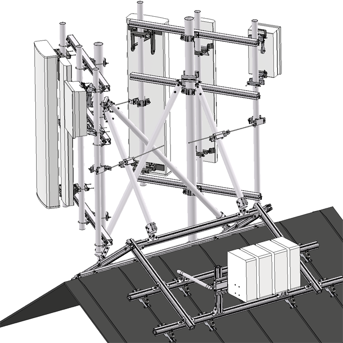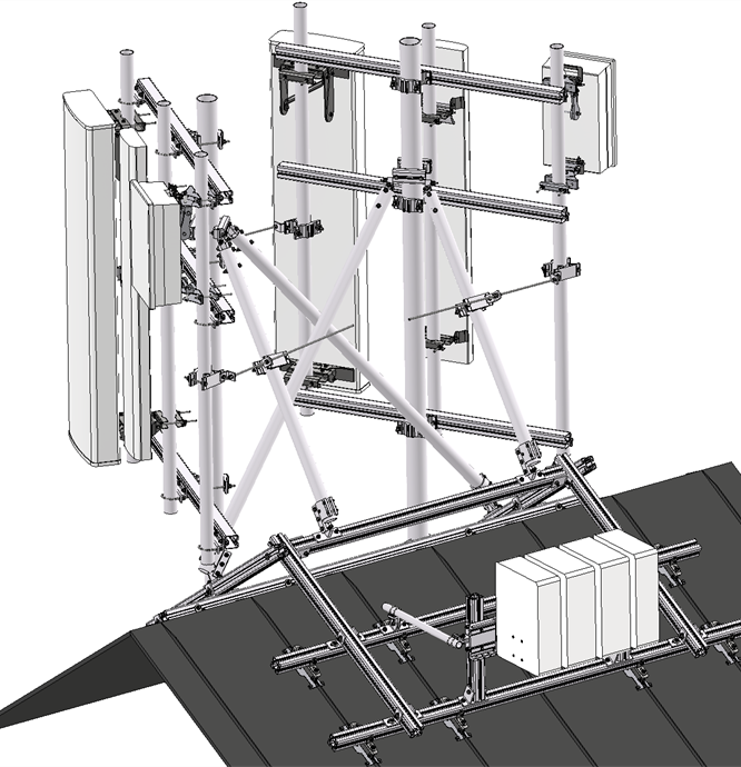 Opcjonalna rama sektorowa 3x2 przesunięta, zawarta w tym przykładzie, oferuje dwie pozycje antenowe w dwóch kierunkach sektorowych.