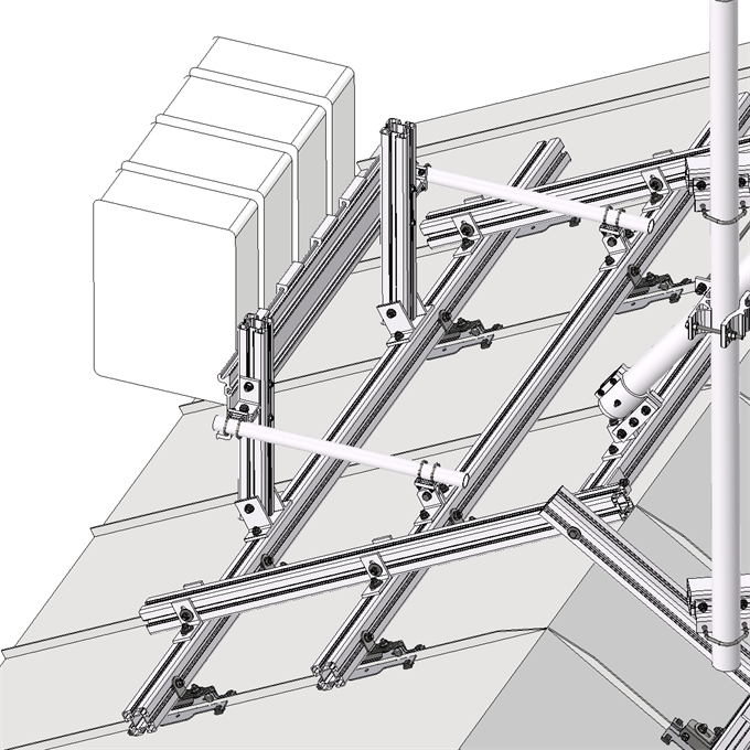 CueDee oferuje różne metody mocowania kompatybilne z różnymi rodzajami powierzchni dachowych; multipłyta; niepenetrujący metalowy zacisk na szew podniesiony blachy (jak w tym przykładzie); lub, montaż na dachówce