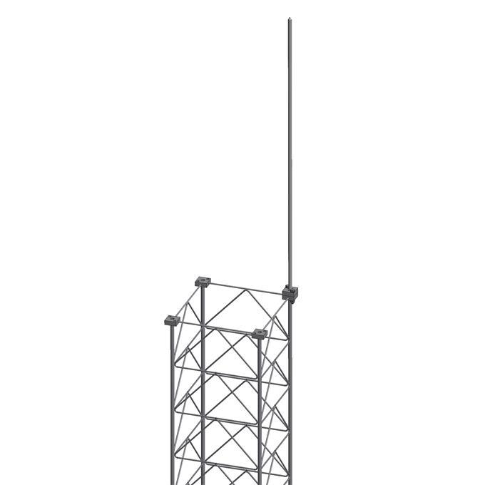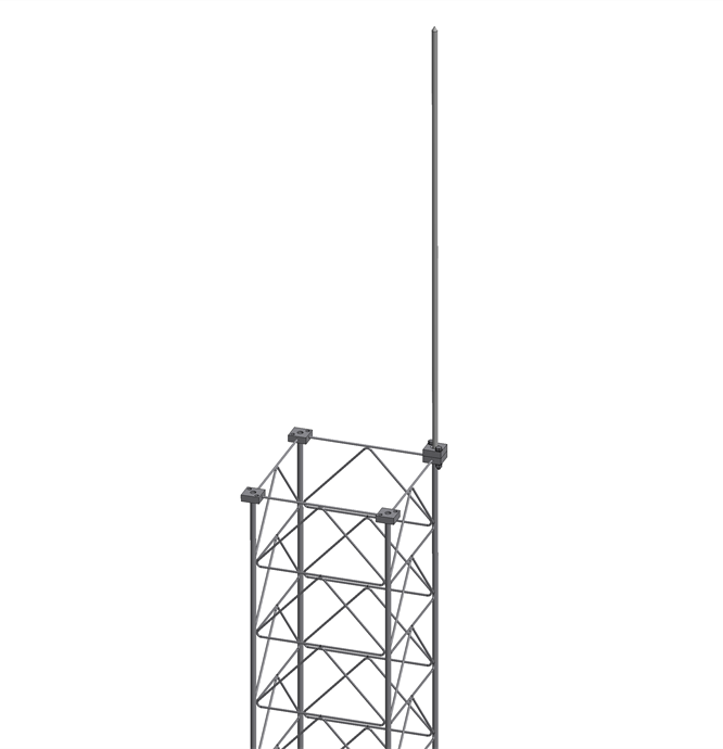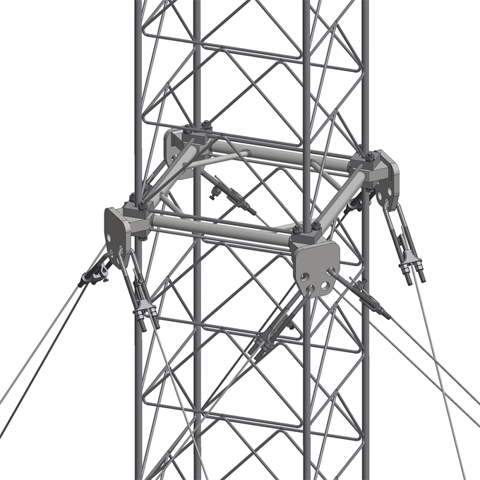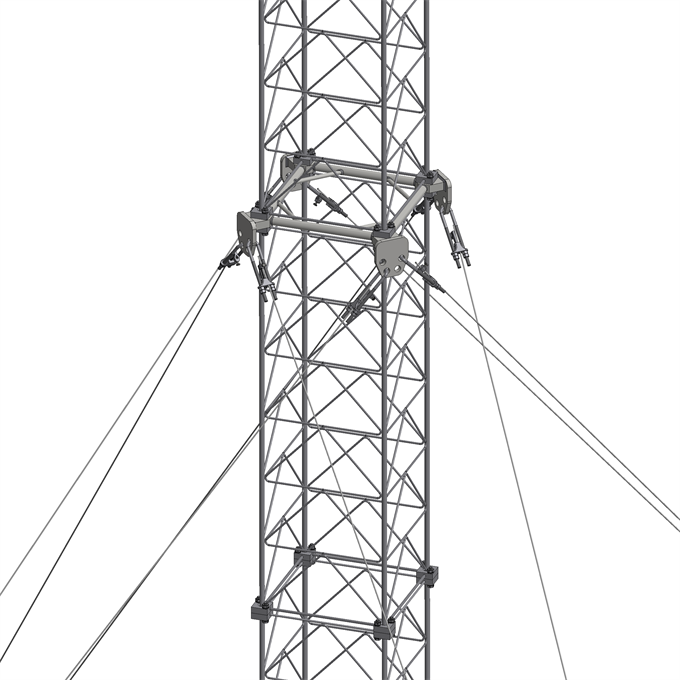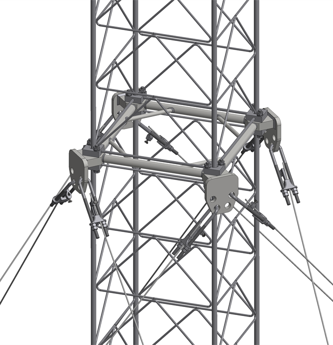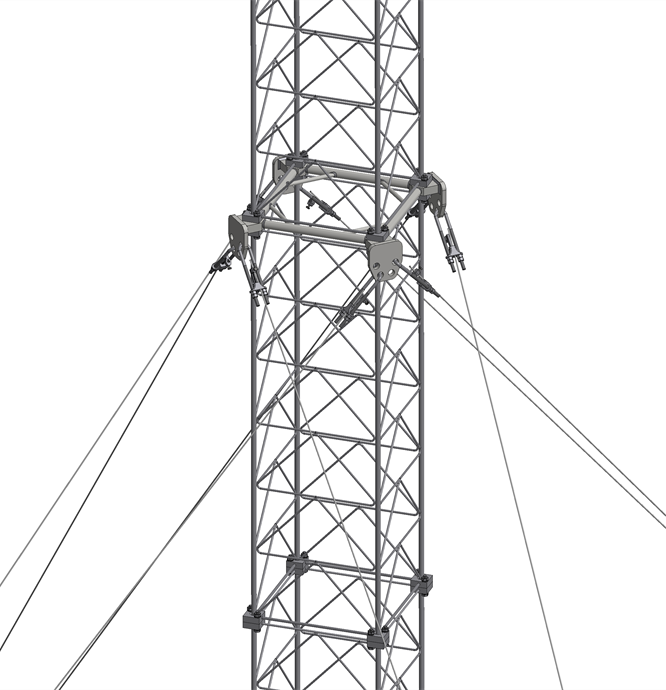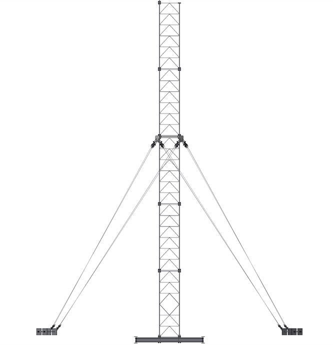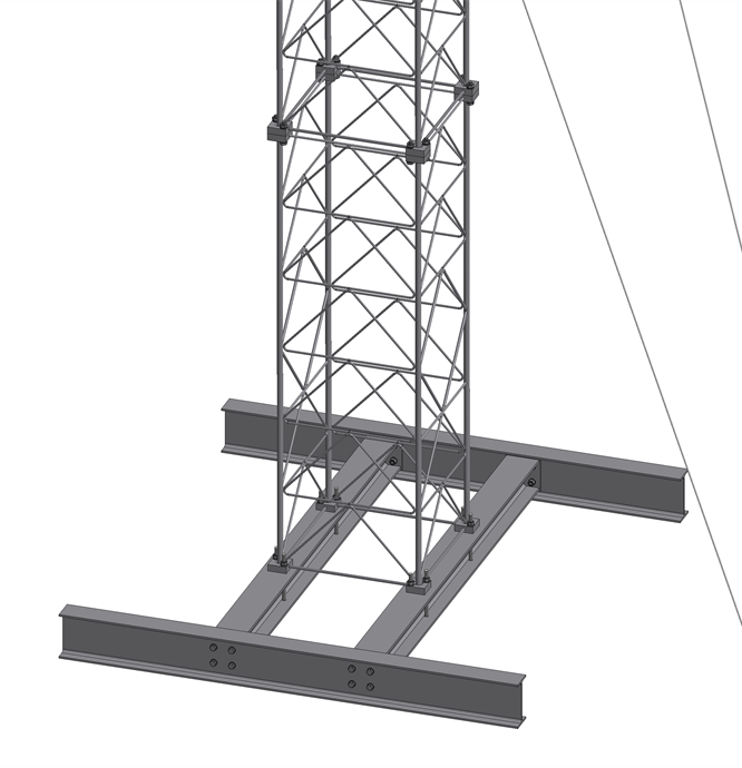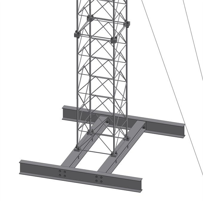 At its base the tower is attached to a steel H-frame that rests directly on the flat roof surface without any mechanical attachment. The torsion-resisting configuration of the guy-wires absorbs all moment of force and the twisting forces generated by the structure resulting in a pure vertical force at the base. Distributed over a wider area by the H-frame.